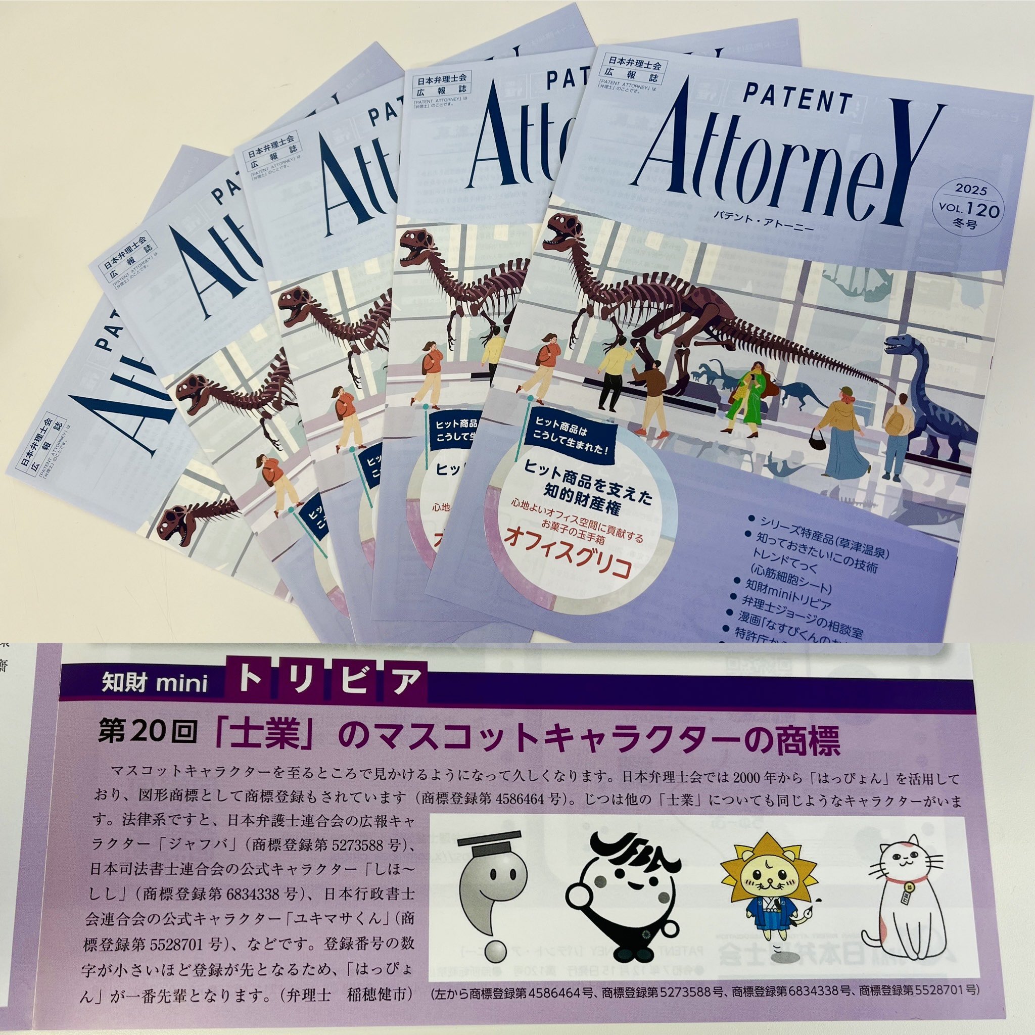 日本弁理士会の広報誌「パテント・アトーニー」の2025年冬号(Vol.120)に、私が担当する「知財miniトリビア」の第20回が掲載されました。タイトルは「『士業』のマスコットキャラクターの商標」です。紙面の関係で、弁 […]...