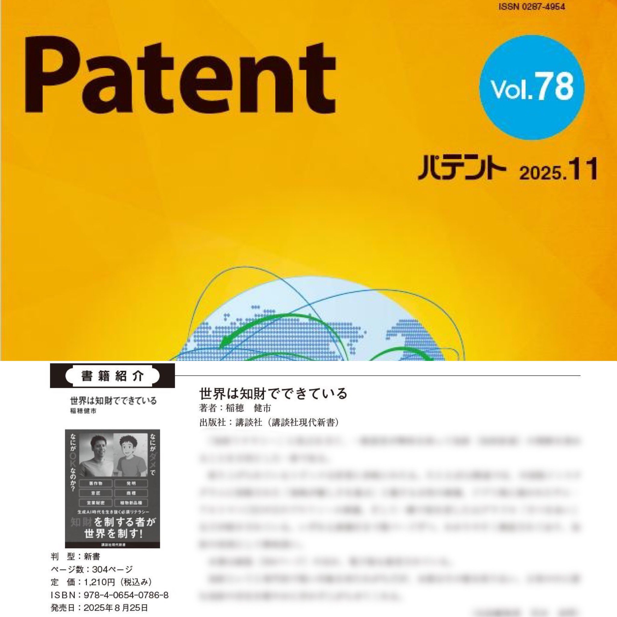 日本弁理士会の会誌である月刊「パテント」(Vol.78 No.12, 2025年11月号)の107ページで、『世界は知財でできている』(講談社現代新書)が紹介されました!掲載していただき誠に光栄です。