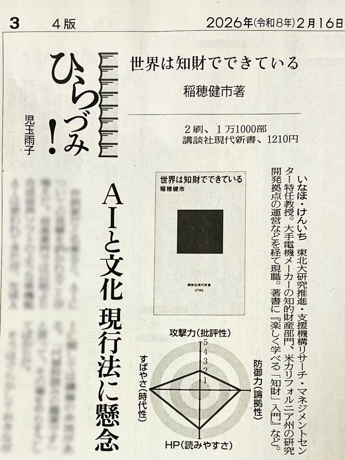 本日(2026年2月16日)の「読売新聞」夕刊の書評コラム「ひらづみ!」(3面)で
